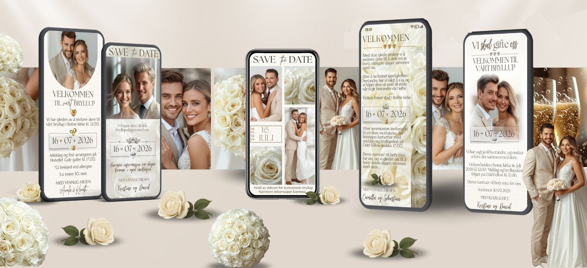 Vi tilbyr invitasjoner, "save the date", video invitasjoner, menyer, bordkort og takkekort – tilpasset deres stil, farger og tema. Velg blant moderne, romantiske og klassiske design, og skap et helhetlig uttrykk som forteller deres historie.